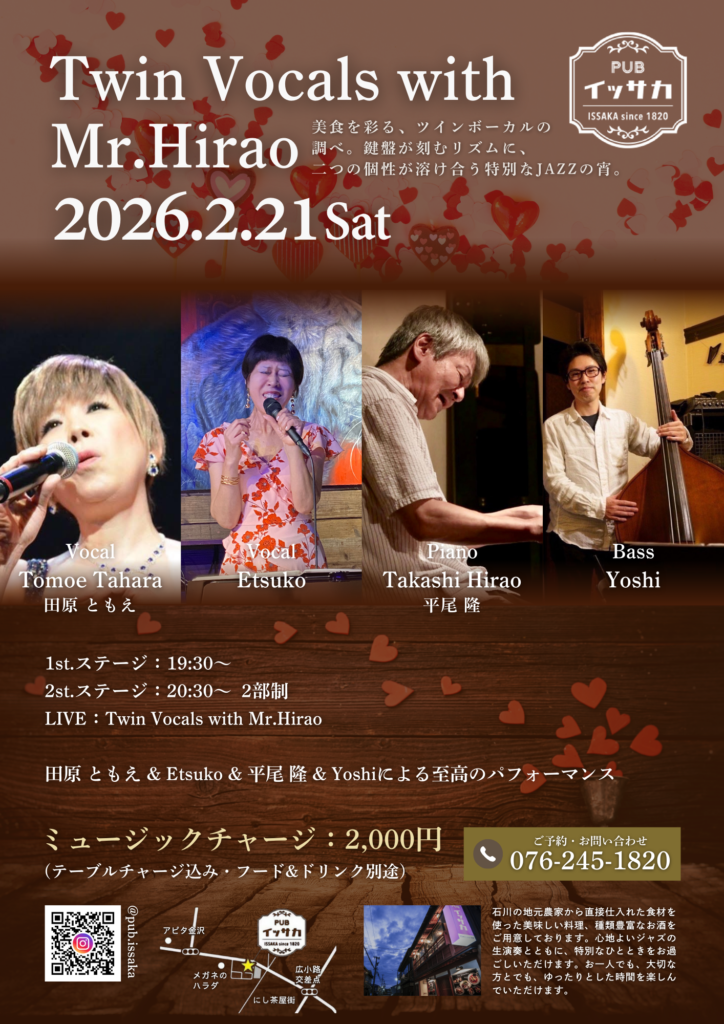 2月21日(土)は Twin Vocals with Mr.Hiraoを開催