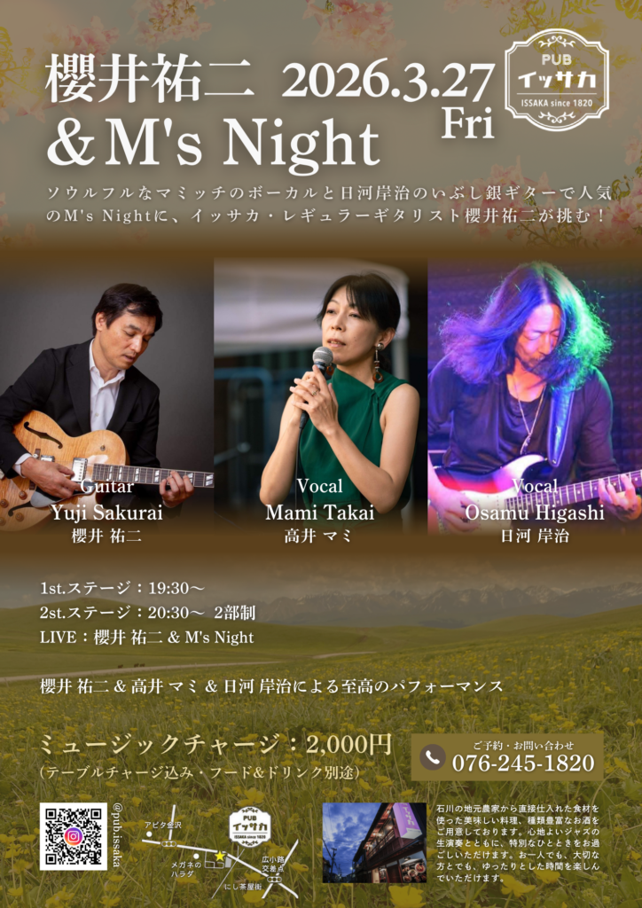 ソウルフルなマミッチのボーカルと日河岸治のいぶし銀ギターで人気のM’s Nightに、イッサカ・レギュラーギタリスト櫻井祐二が挑む!